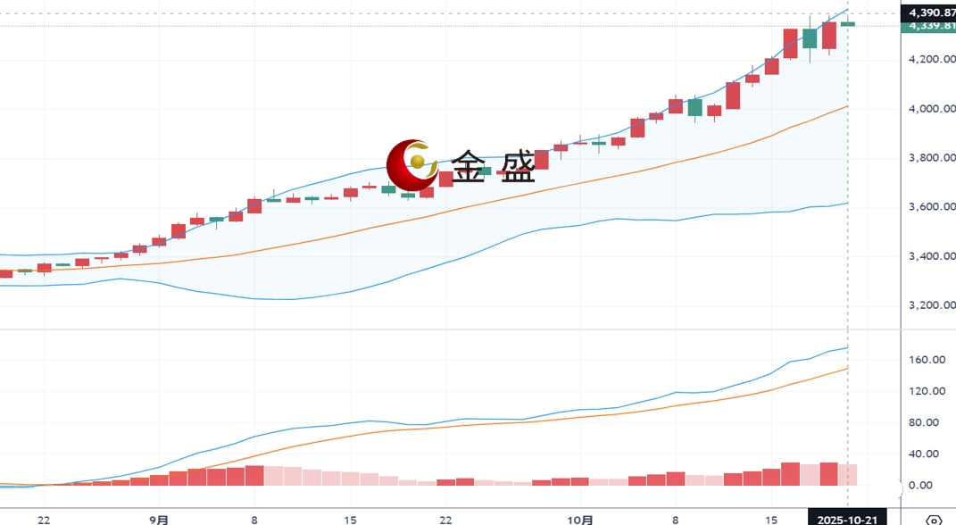 现货黄金周一(10月20日)亚市早间开盘于4248.92美元/盎司,最高4381.64美元/盎司,最低4218.65美元/盎司,收盘4355.72美元/盎司,全天波幅约173美金,当日涨幅约2.47%。