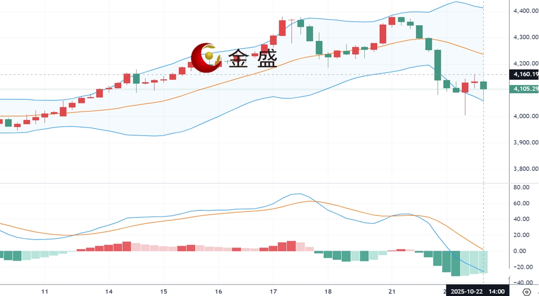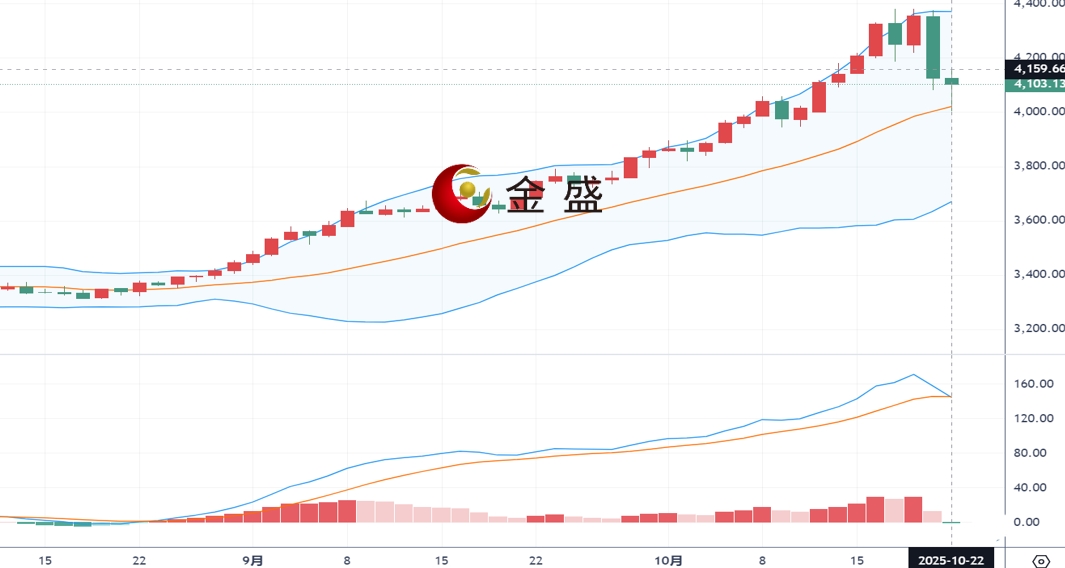 现货黄金周三(10月22日)开市于4125.52美元/盎司,盘中探底回升V型反转走势,早盘一度跌至4000关口附近,欧盘时段一度恢复至4160美元附近,此前金价在周二经历了多年来最剧烈的抛售行情。由于对美国政府停摆影响的担忧以及全球政府债务不可持续的持续恐慌,贵金属价格在逢低买盘的支撑下小幅走高。