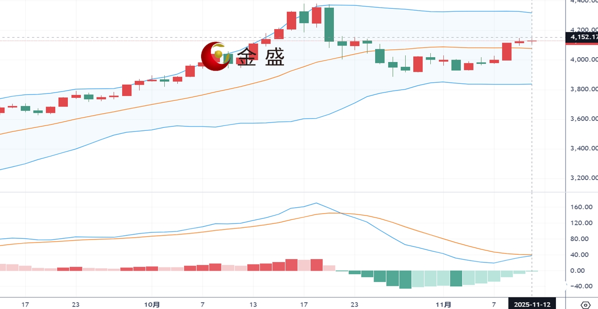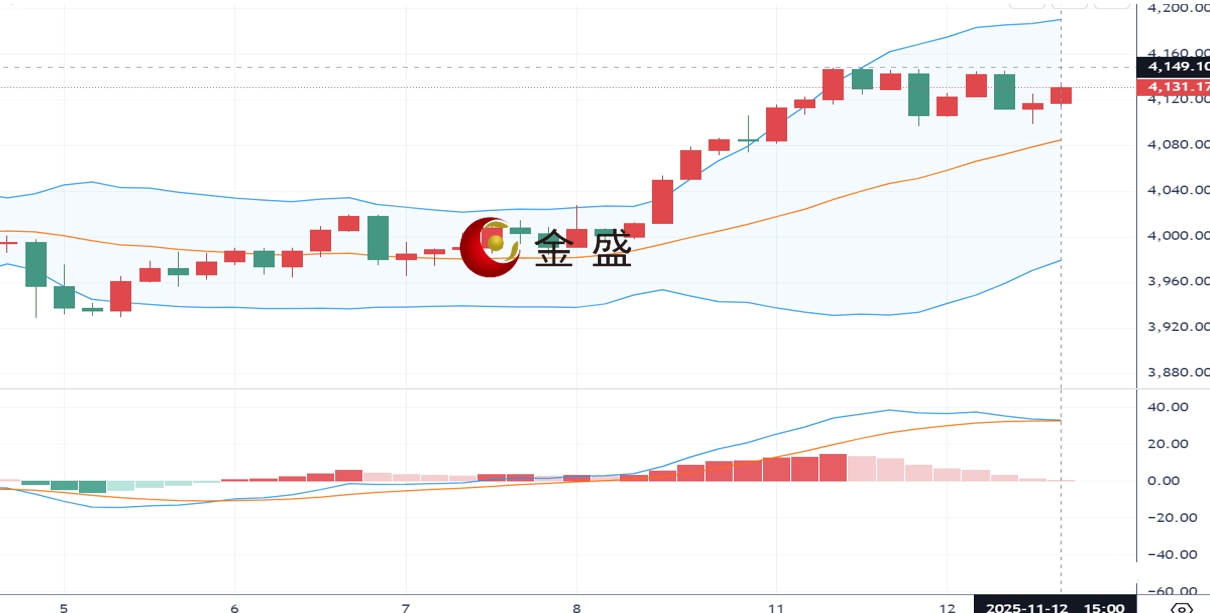 现货黄金周三(11月12日)开市于4127.76美元/盎司,盘中在三周高位附近盘整,市场押注美国联邦储备委员会年底前可能降息25个基点,概率高达68%。就业数据疲软进一步强化了宽松预期,支撑金价走强。然而,美国政府停摆危机若在短期内缓解,可能削弱黄金的避险吸引力,令涨势面临考验。