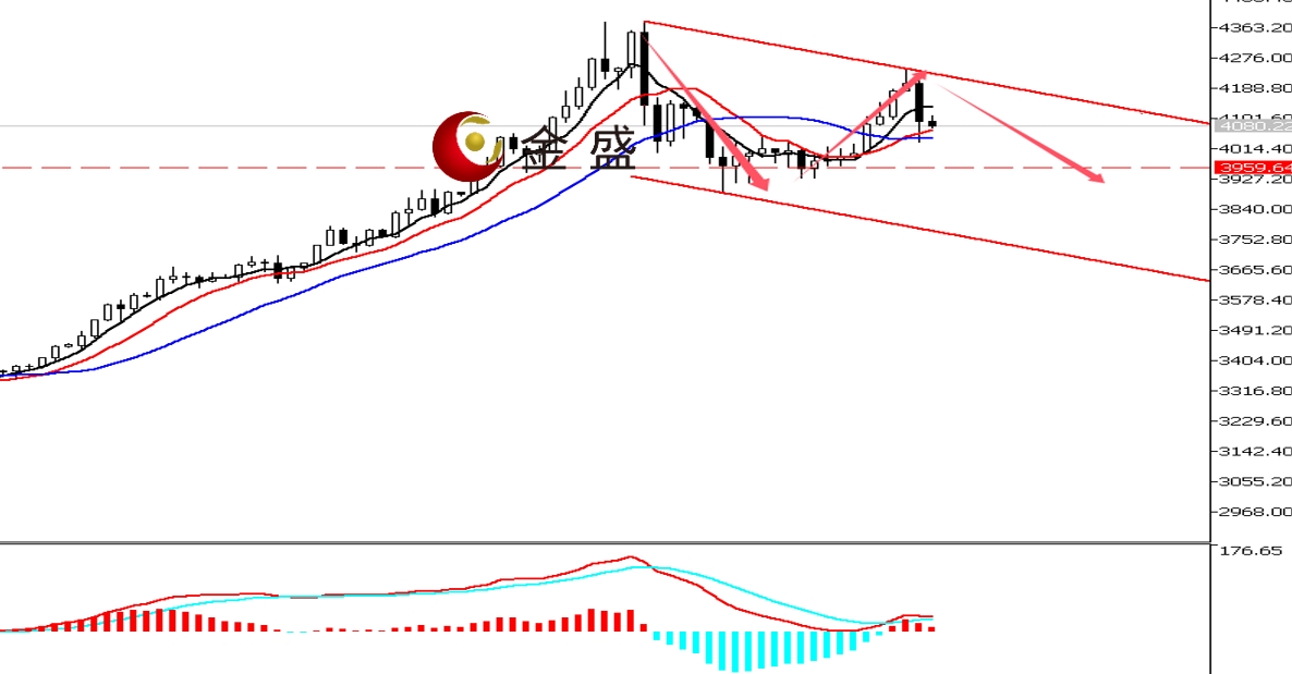 日线图,黄金前三天以上行为主,周四冲高回落,确认4200上方压力很强,周五加速下挫。均线系统不断收敛,布林带中轨对价格反弹形成支撑。MACD指标快慢线零轴上方走平,做多的动能衰竭。黄金中长期上行趋势不变,当前进入高位震荡。本周向上突破近十天的整理结构,但后半周大幅调整,可见高位抛压明显。行情高位休整的次高点或以形成,后市先看图示的下行通道。下周行情或再次测试四千关口得失,操作上高抛低吸。