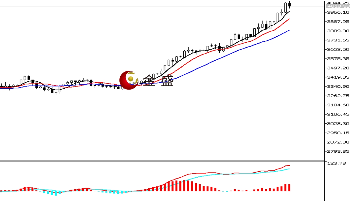 前一个交易日,白盘时段,行情开市即创当日低点3983.24美元,随后连续阳线上行突破4000美元大关。晚盘时段,行情涨势减缓,价格震荡上行,尾盘创当日高点4058.96美元,日图再收阳线。均线系统多头排列,运行在价格下方形成支撑。MACD指标快慢线零轴上方现金叉,做多的动能为主。黄金上行趋势不变,连续四日收阳。价格站上4000美元大关,短期关注此关口的得失,操作上调整做多为主。