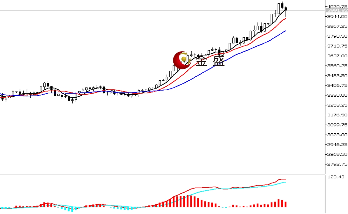 前一个交易日,白盘时段,黄金早盘多次回踩4000美元关口止跌回升,午后震荡上行为主,日内走V型。晚盘时段,行情上行至前高4058美元一带转跌,价格跌破白盘低点出现加速下挫,盘中打破多个支撑位,价格最低至3944.77美元,日图收中大阴线。均线系统多头排列,运行在价格下方形成支撑。MACD指标快慢线零轴上方现金叉,做多的动能减弱。黄金上行趋势不变,日图形成阴包阳反转信号,周内连阳被终结。行情高位调整的力度有所增强,短期偏向震荡下行,操作上高抛为主。