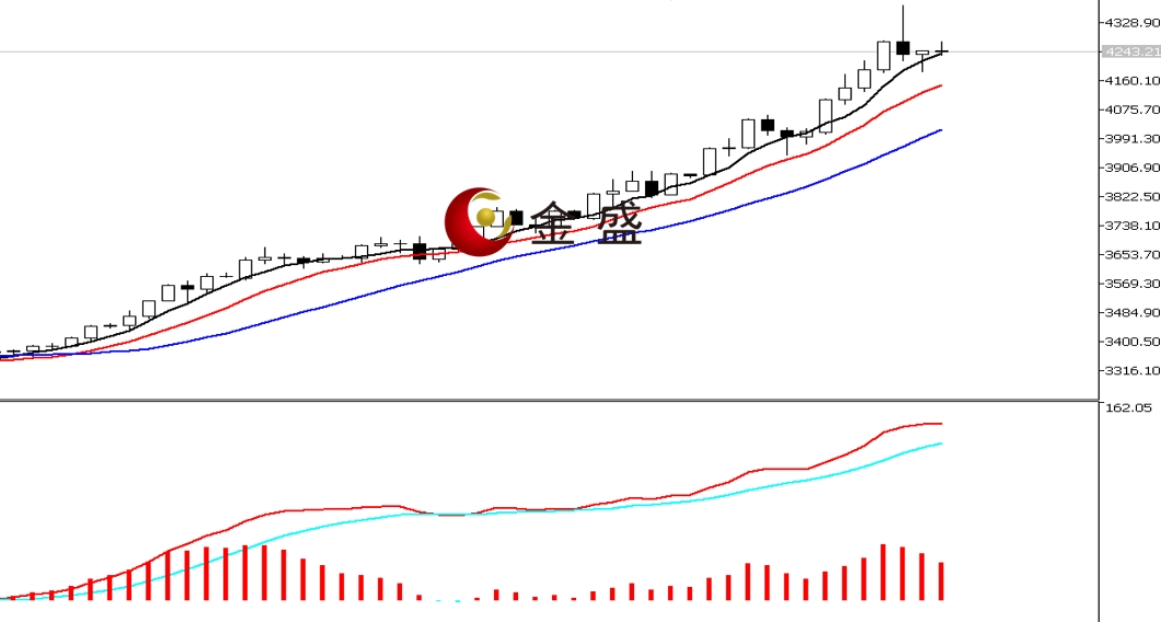 前一个交易日,早盘时段,黄金多空分歧加大,价格开市短暂上冲至当日高点4380美元一带,随后跳水一百美金。午后再度承压早盘高点震荡下行。晚盘时段,行情加速下行,价格跌破4300、4200美元关口,创当日低点4186.08美元,尾盘有所反扑,最终收有影线的阴K。均线系统多头排列,价格回踩五周期均线。MACD指标快慢线零轴上方现金叉,做多的动能为主。黄金上行趋势不变,上周五出现大幅回撤,日内高低点近两百美金,空头力度相比之前有所增强。短期盘面或进入高位的休整,具体的整理结构还需时间观察,操作上高抛低吸。