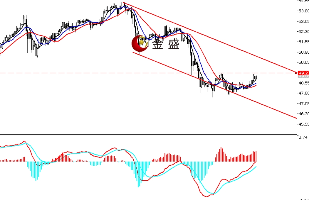 前一个交易日,白银早盘探底回升,午后回吐全部涨幅,晚盘窄幅整理,最终收跌0.46%。今天行情继续低位休整,但价格重心不断上移,午后重回昨日高点。小时周期,均线系统不断收敛,价格围绕其震荡。MACD指标快慢线零轴下方现金叉,做多的动能增强。白银进入调整周期,走势形成图示的下行通道。价格形成47.7—49.2的箱体结构,短期关注区间如何跌破。