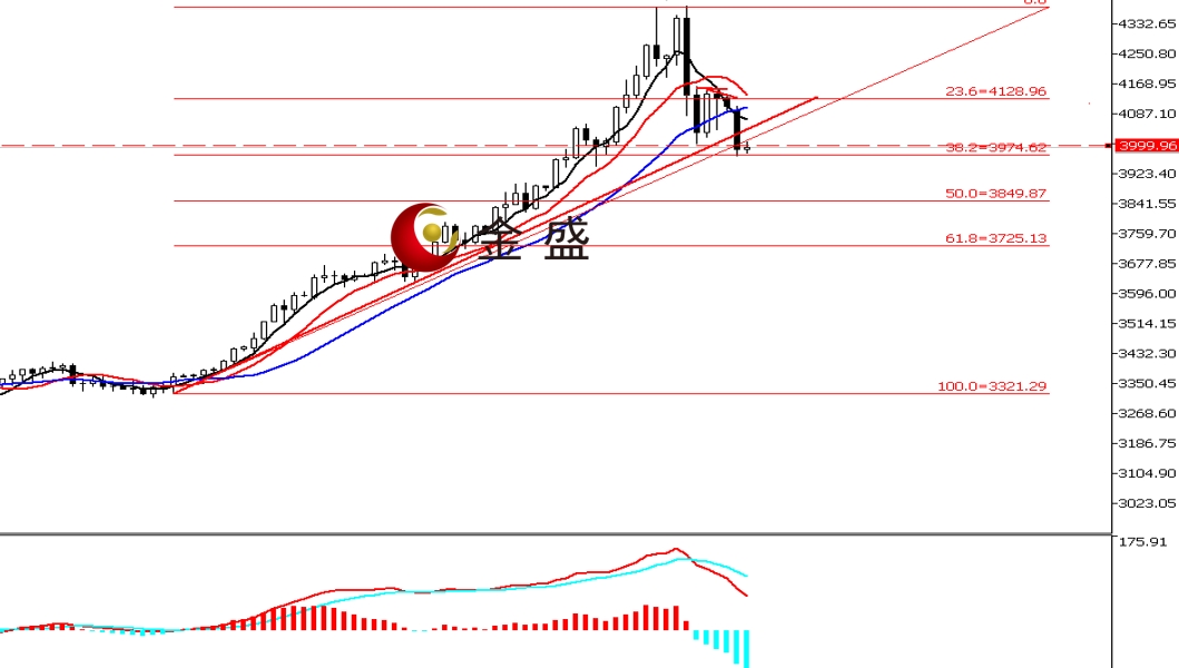 前一个交易日,白盘时段,黄金低开反抽,多头短暂回补跳空缺口,价格创当日高点4108.61美元,随后震荡下行。晚盘时段,多头反扑无力,行情继续走低,盘中一小时下挫逾四十美金,价格跌破四千关口,创日内低点3971.32美元,日图收饱满阴线。均线系统收敛向下拐头,价格跌破布林带中轨。MACD指标快慢线零轴上方现死叉,做空的动能为主,指标继续回调。黄金打破上周整理区间,价格跌破上行趋势线。短期金价不能快速站稳四千大关,即确认向下突破有效,则后市调整空间将打开。