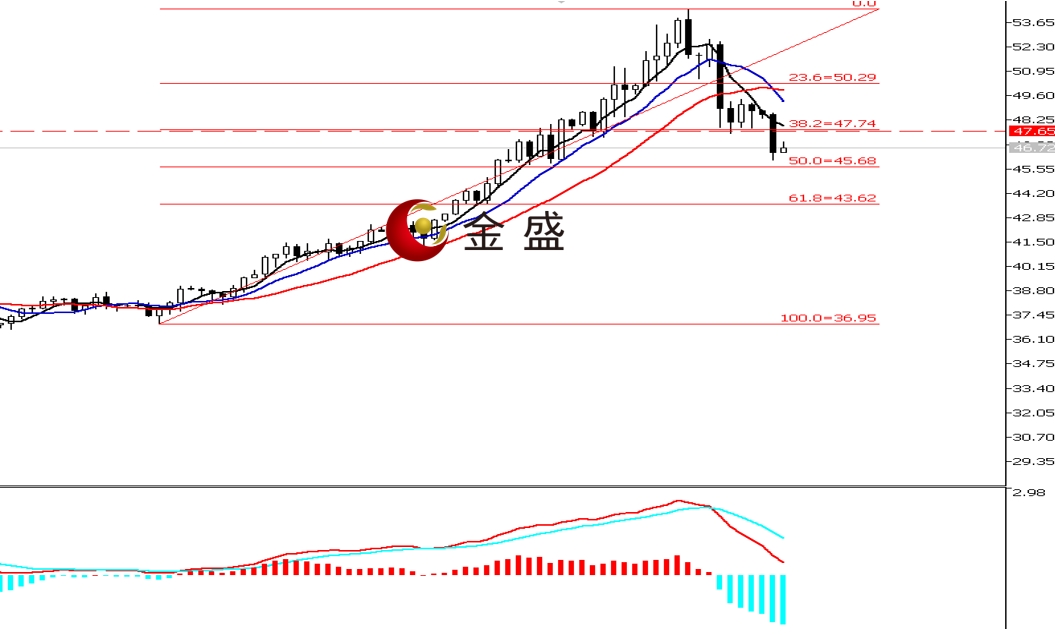 前一个交易日,白盘时段,价格承压48.6美元一带低开低走,午后围绕48美元一带有所震荡,但多头反弹高度有限。晚盘时段,行情加速下挫跌破47美元大关口,价格最低至46美元一带,最终收中阴线。均线系统收敛向下拐头,对价格反弹形成阻碍。MACD指标快慢线零轴上方现死叉,做空的动能增强。白银跌破上周低点,确认下行空间打开,日图的第一波调整还进行中。下方强支撑看45.6美元一带,此处是周线九连阳的50%一带,操作上高抛低吸。