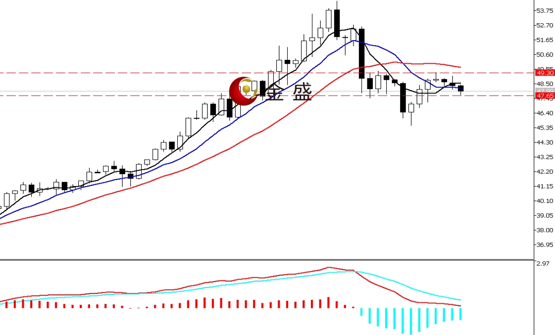 前一个交易日,白盘时段,行情依托48美元附近的支撑震荡上行,午后创当日高点49.07美元。晚盘时段,行情拐头下行,盘中一小时下挫逾1%,多头回吐白盘全部涨幅,尾盘创当日低点47.97美元,日图收阴线。均线系统不断收敛走平,对价格反弹形成阻碍。MACD指标快慢线零轴上方现死叉,做空的动能减弱。白银日图连续两日,价格跌破48美元关口。技术形态构筑头肩底雏形,左右肩支撑在47.6美元一带,短期关注这一带能否止跌企稳,操作上调整做多为主。