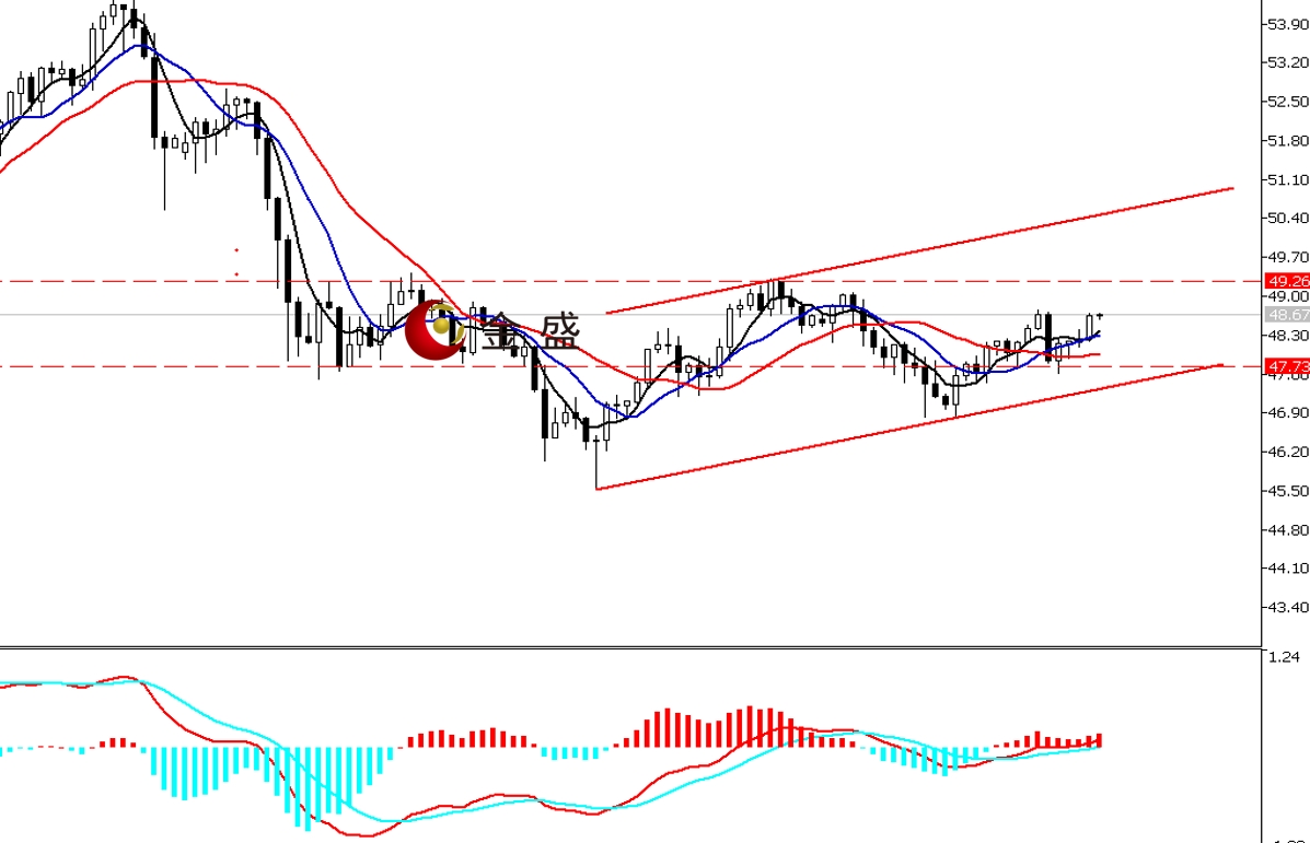 前一个交易日,金银走势共振,白银也是先涨后跌走倒V字型,最终收十字星。今天白盘行情持续反扑,午后价格重回昨日高点附近。四小时周期,均线系统收敛向上拐头,对价格上行构成支撑。MACD指标快慢线零轴附近现金叉,做多的动能增强。周内白银回调至47美元一带止跌回升,确认二次探底结束。昨日虽走尖顶结构,但今天收复昨日全部跌幅,走势形成V型结构,并再次强化47.6美元一带的支撑有效,后市偏向形成图示的上行通道,操作上调整做多为主。
