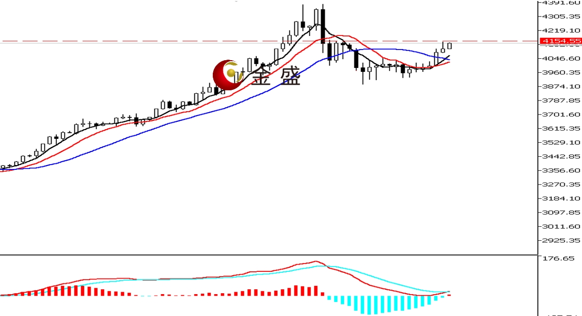 前一个交易日,白盘时段,黄金先延续上行,午后承压4150美元一带横盘震荡,小时图形成双顶雏形。晚盘时段,空头力度增强,多头回吐白盘全部涨幅,价格回落至4100美元一带,尾盘有所反抽,最终收十字星。均线系统收敛向上拐头,运行在价格下方形成支撑。MACD指标快慢线零轴附近现金叉,做空的动能衰竭。行情将进入二次探顶的阶段,后市偏向测试4200美元一带的压力,即前一波调整黄金分割位的61.8%附近。昨日金价受阻4150美元一带有调整,但盘中调整空间有限,可见多头筹码惜售,操作上调整做多为主。