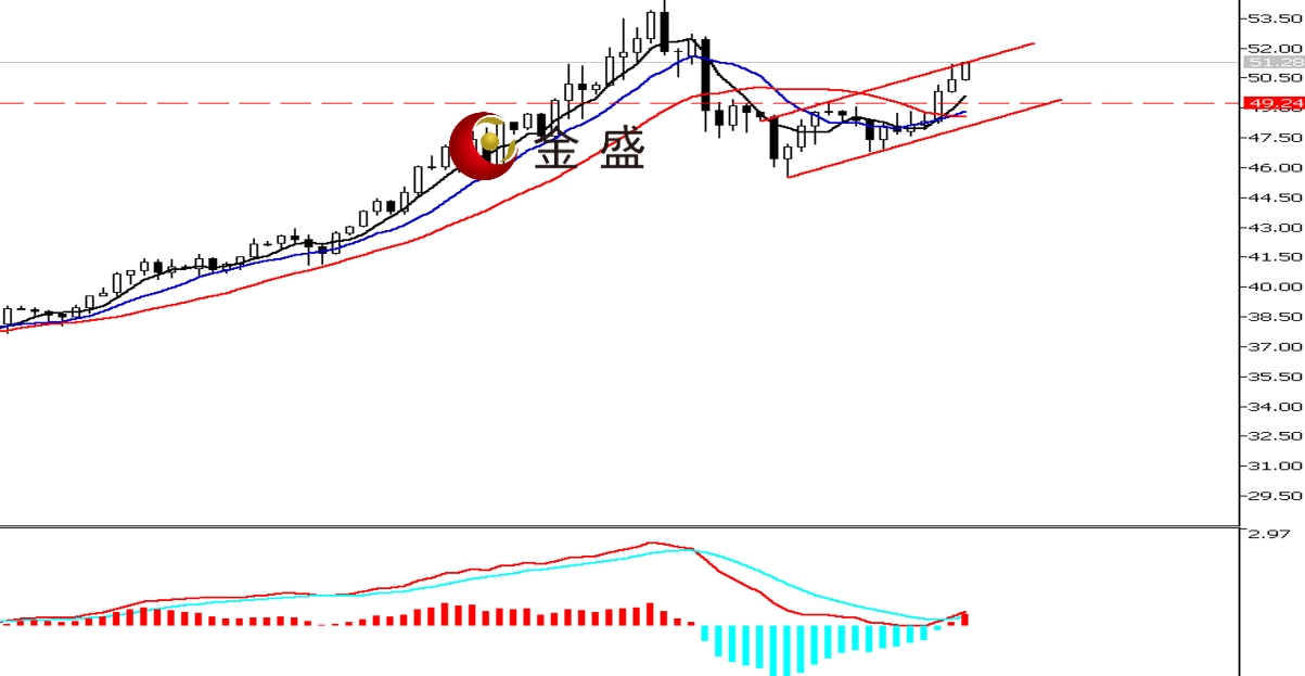 前一个交易日,白盘时段,行情延续上行,早盘即刺破51美元关口,但多头力度放缓,午后有所调整。晚盘时段,多空围绕51美元一带博弈,价格先跌后涨走V字型,价格最低至50.24美元,尾盘收复全部跌幅,并创当日新高51.21美元,日图收阳线。均线系统收敛向上拐头,对价格反弹形成支撑。MACD指标快慢线零轴上方现金叉,做多的动能有增强的迹象。白银延续通道内运行,昨日承压通道上轨有调整,但日图K线未出现明显的承压信号,短期依然关注51美元关口的得失,操作上调整做多为主,压力位出现反转信号博弈调整。