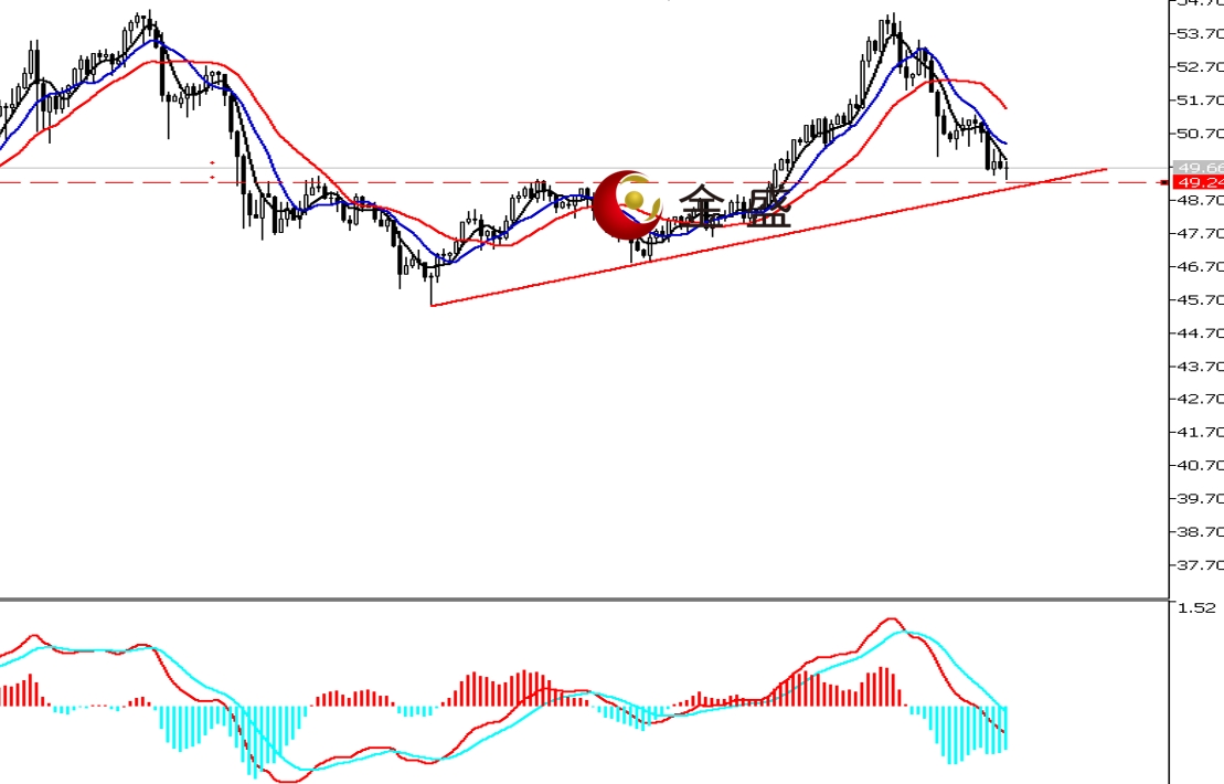 前一个交易日,白银大部分时间横盘震荡,但尾盘跟随黄金跳水,强势跌破50美元大关,最终收跌0.69%。今天白盘行情继续调整,午后刺破昨日低点有反抽。四小时周期,均线系统向下拐头,对价格上行构成阻碍。MACD指标快慢线零轴上方现死叉,做空的动能为主。白银高位回吐上周大部分涨幅,多头强势结构被破坏。近期上行的低点形成图示的支撑线,短期关注49.3—49区间的支撑,操作上高抛低吸。